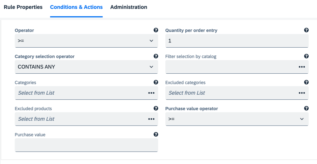 Below is a screenshot showing how to configure the promotion rule conditions in SAP Commerce Cloud: